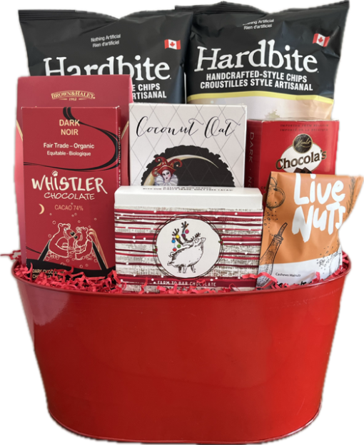 ALL OUR BASKETS ARE CREATED AT OUR LOCAL (VANCOUVER) WAREHOUSE. THEY ARE WRAPPED IN CELLO AND TIED WITH CURLING RIBBON AND A HANDMADE BOW. WE LIKE TO HIGHLIGHT LOCAL AND BC MADE PRODUCTS