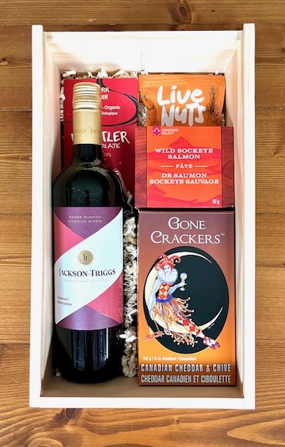 THIS MADE IN LANGLEY, BC WOOD WINE BOX FEATURES BC WINE, WHISTLER DARK CHOCOLATE BAR AND A SELECTION OF LOCAL SAVORY TREATS. GONE CHEDDAR CRACKERS, WILD SOCKEYE SALMON PATE AND LIVE NUTS. WE LOVE LOCAL !!